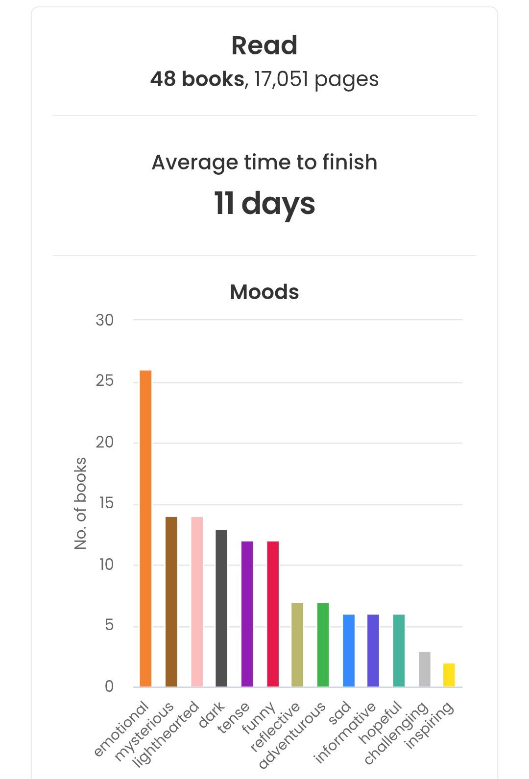 I can name a couple of reasons for this: 1. A rough start to this school year that lasted until the end of October made me less interested in reading and more interested in coming home to disassociate rather than engage my brain with more words. 2. Quite a few books this year were a SLOG to get through (I'm looking at you The Heartbreak Hotel and Great Big Beautiful Life). 3. My favorite author put out a book that I genuinely did not enjoy, took me 2 months to read, and generally bummed me out (again, looking at you Great Big Beautiful Life).